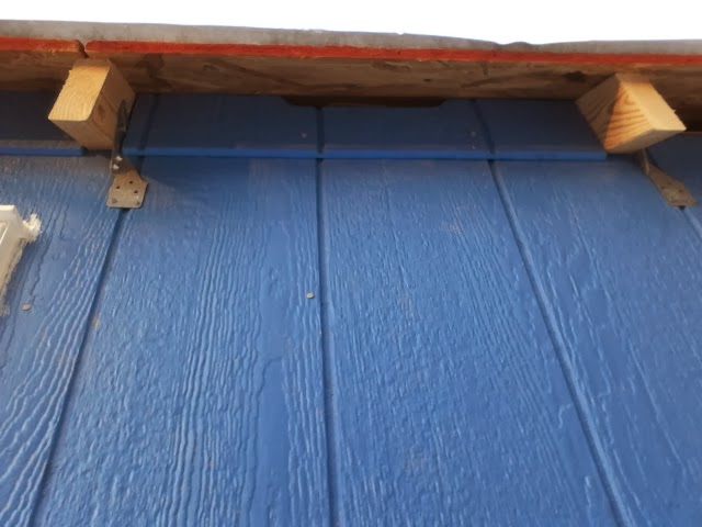 So today I cut and put up the siding above the porch. I had to do a little piecing on one side, but once it is painted it won't be noticeable. I had some difficulty hammering because of the angle of my arm in relation to the wall. Such a strange kinesiology thing. Anyway, here is a pic of the mostly finished siding.